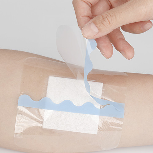 - Remove one side of the release liner, and place the cover over the wound and surrounding skin.